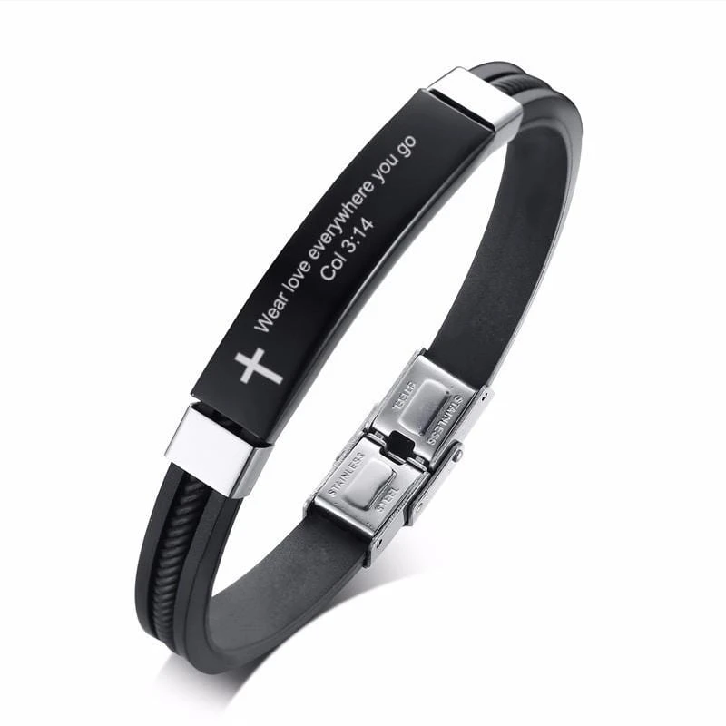 Just a glance at this beautiful Silicone Bible Verse Bracelet and be filled with the harmony of Love. Finely engraved with Colossians 3:14.