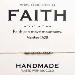 A beautiful and thoughtful gift for a loved one or yourself. This minimalist Christian bracelet carries a secret message that only the wearer will know using Morse code. Take comfort in the words of the Bible with a quote from Matthew 17:20 on the backing card: “Faith can move mountains”. Packaged inside a premium gift box.Â