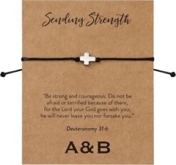 Fixed to quality 500GSM card printed with “Sending Strength” “Be strong and courageous. Do not be afraid or terrified because of them, for the Lord your God goes with you; he will never leave you nor forsake you. Deuteronomy 31:6.” These powerful words are sure to provide comfort and strength during tough times.