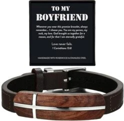 Christian bracelet for your boyfriend. Card printed with: “Love never fails.” 1 Corinthians 13:8. Packaged inside a premium gift box.